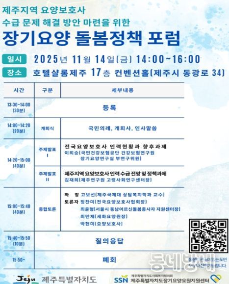 동네방네 김형규 기자 | 제주특별자치도는 제주지역 요양보호사 인력수급 문제 해결을 위해 오는 11월 14일 오후 2시 호텔샬롬제주 컨벤션홀에서 전문가와 현장 종사자들이 한자리에 모여‘장기요양 돌봄 정책 포럼’을 개최한다고 밝혔다.