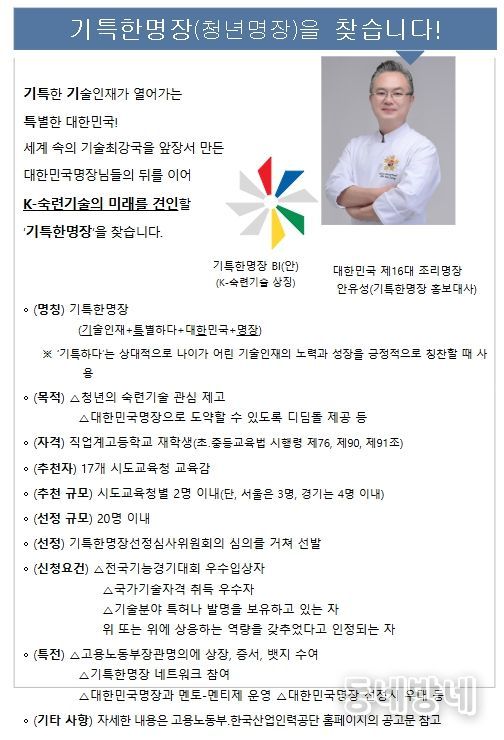 동네방네 김형규 기자 | 고용노동부는 청소년·청년 기술인재를 조기에 발굴해 숙련기술 인재로 성장을 지원하기 위해 '기술인재특별한대한민국명장' 제도를 새로 도입해 시행한다고 밝혔다.