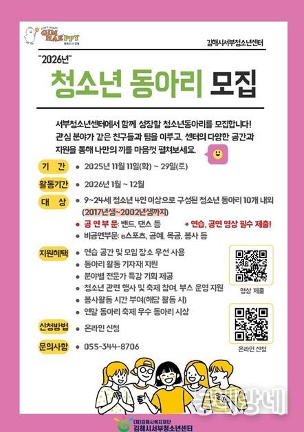 동네방네 김형규 기자 | 김해시복지재단 김해시서부청소년센터가 청소년의 자율적 참여와 주도적 활동을 강화하기 위해 ‘2026년 청소년운영위원회 및 청소년동아리’를 모집한다고 밝혔다.