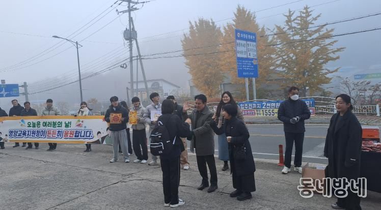 동네방네 김형규 기자 | 경상북도영양교육지원청은 2025년 11월 13일 오전 7시 10분부터 영양여자중·고등학교 정문에서 2026학년도 대학수학능력시험에 응시하는 수험생을 대상으로 수험생 응원 행사를 진행했다.