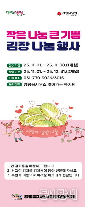 한편, 김장 나눔 참여를 희망하는 주민은 11월 1일부터 30일까지 양평읍 찾아가는 복지팀(☎ 031-770-3026, 3015)에 기부 신청할 수 있으며, 신청자에게는 김치통이 제공된다. 기부된 김치는 복지 대상자 중 꼭 필요한 가구를 선정해 전달될 예정이다.