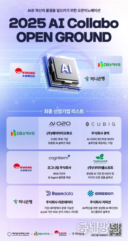 동네방네 김형규 기자 | 제주창조경제혁신센터(대표이사 이병선, 이하 제주센터)는 DB손해보험, 조광페인트, 하나은행과 함께 추진하는 특화산업 오픈이노베이션 ‘2025 AI 콜라보 오픈그라운드 프로그램’을 통해 최종 6개 스타트업을 선정하고, 기술 테스트와 솔루션 개발을 통해 실질적인 사업화 협력에 나선다.