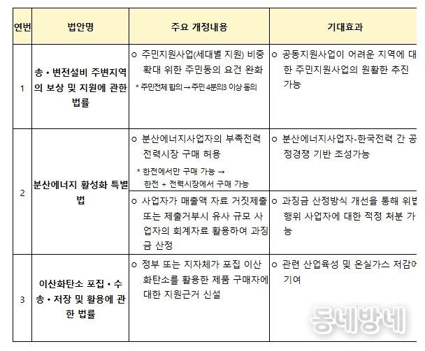 동네방네 김형규 기자 | 기후에너지환경부는 △‘송‧변전설비 주변지역의 보상 및 지원에 관한 법률’, △‘분산에너지 활성화 특별법’ 등 3개 법 개정안이 11월 13일 국회 본회의를 통과했다고 밝혔다. 개정안별 주요내용은 다음과 같다.