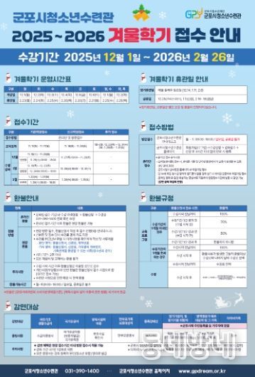 군포시청소년수련관(관장 박윤정)은 “이번 겨울학기는 군포 시민들이 새로운 배움과 여가를 함께 즐길 수 있도록 준비했다”며 “청소년은 물론 전 세대가 어울리는 따뜻한 배움터로 운영하겠다”고 말했다.