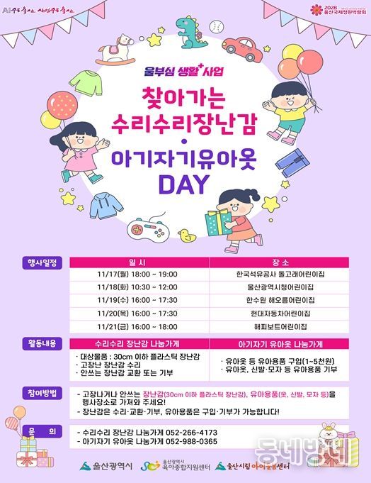 동네방네 김형규 기자 | 울산시는 오는 17일부터 21일까지 5일간 관내 주요 직장어린이집을 대상으로 ‘우리아이, 행복배달 사업(프로젝트): 찾아가는 장난감·유아옷 데이(DAY)’ 행사를 진행한다고 밝혔다.
