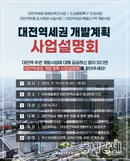 이번 설명회는 대전시와 ㈜대전역세권개발PFV 공동주관으로 개최되며, 대전역세권 개발계획의 주요 내용과 추진 현황, 향후 일정 등을 주민들에게 공유하고 원도심의 미래 비전을 소개하는 시간으로 진행될 예정이다.