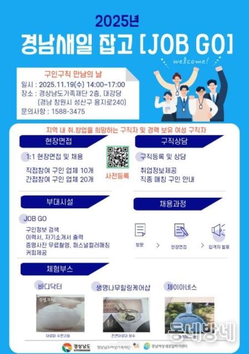 동네방네 김형규 기자 | 경상남도는 19일 오후 2시 경남여성가족재단 대강당에서 여성 취・창업 활성화를 위해 ‘2025년 구인・구직 만남의 날, 잡고(JOB-GO)’ 채용행사를 개최한다고 밝혔다.