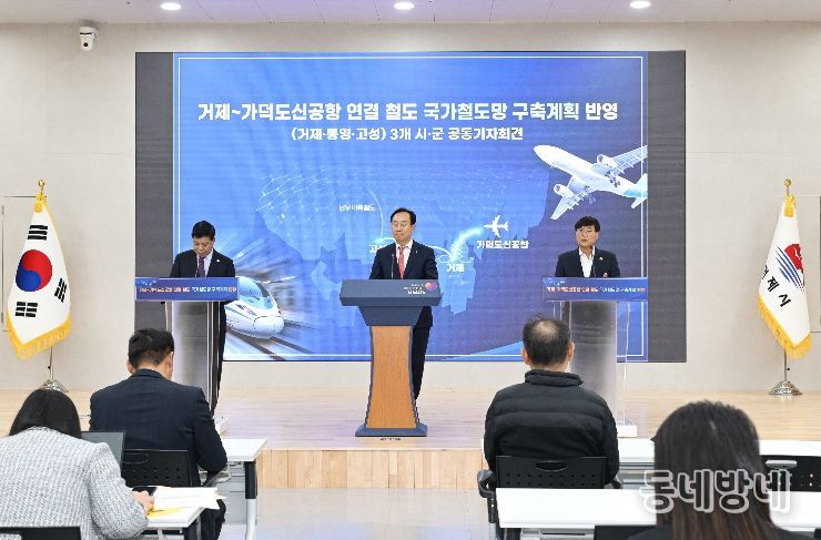 동네방네 김형규 기자 | 거제시는 17일 오후 2시 거제시청 대회의실에서 통영시․고성군과 함께 ‘거제~가덕도신공항 연결철도’의 제5차 국가철도망 구축계획 반영을 촉구하는 공동 기자회견을 개최했다.