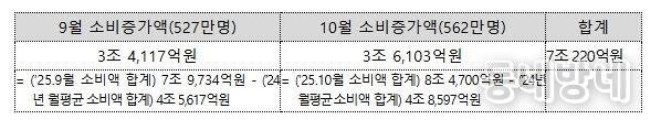 한편, 9·10월 환급(페이백) 지급 대상자(중복 포함, 1,089만명)가 작년 월평균 카드 소비액보다 총 7조 220억원을 더 지출한 것으로 확인됐다. 이는 지급액(6,430억원)의 11배에 달하는 규모다.