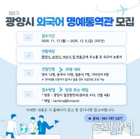 동네방네 김형규 기자 | 광양시가 국제교류 현장에서 활동할 ‘제8기 외국어 명예통역관’을 모집한다.