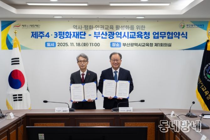 동네방네 김형규 기자 | 제주4·3평화재단(이사장 김종민)과 부산광역시교육청이 올바른 역사관 함양과 교사 및 학생 대상의 내실 있는 역사·평화·인권교육 활성화를 위한 협력을 목적으로 11월 18일 부산광역시교육청에서 업무협약(MOU)을 체결했다.