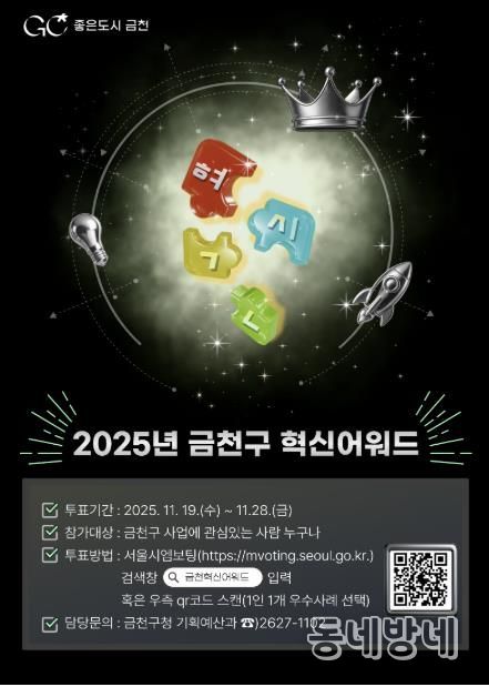 동네방네 김형규 기자 | 금천구는 11월 19일부터 11월 28일까지 10일간 ‘2025년 금천혁신어워드’ 온라인 투표를 진행한다고 밝혔다.