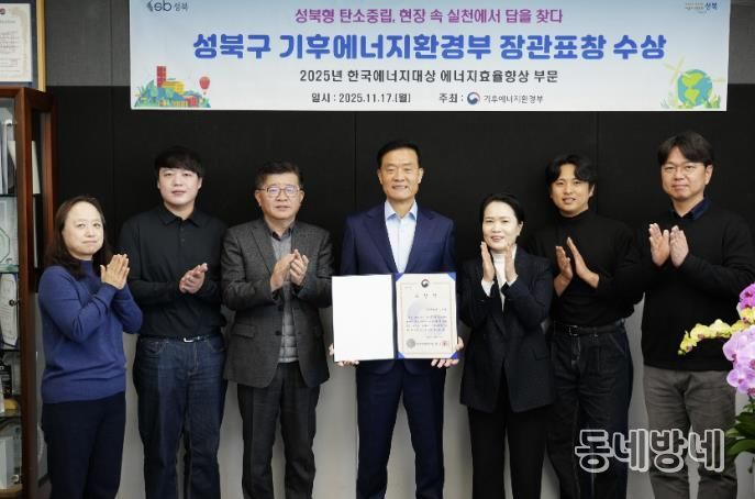 동네방네 김형규 기자 | 서울 성북구가 지난 17일 더플라자 서울 호텔에서 열린 '2025년 한국에너지대상 시상식'에서 에너지 절약 및 효율 향상 유공 부문 기후에너지환경부 장관 표창을 받았다. '한국에너지대상'은 국가 에너지 효율 향상과 온실가스 감축에 기여한 기관, 단체, 개인에게 수여되는 국내 최대 규모의 에너지 분야 포상으로, 이번 수상은 성북구가 추진한 주민 참여형 에너지 절약 정책과 탄소중립 실천 노력이 전국적으로 높은 평가를 받은 결과다.