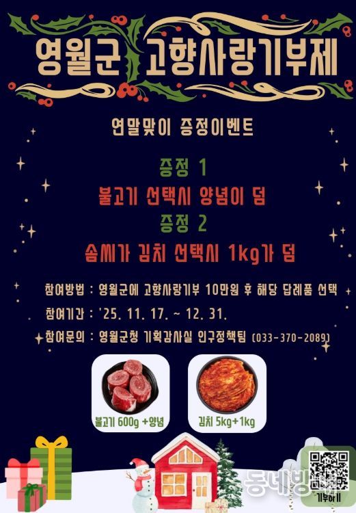 동네방네 김형규 기자 | 영월군은 연말을 맞아 고향사랑기부제 기부자에게 감사의 마음을 전하고자 연말맞이 전원 증정 답례품 증량 이벤트를 진행한다.