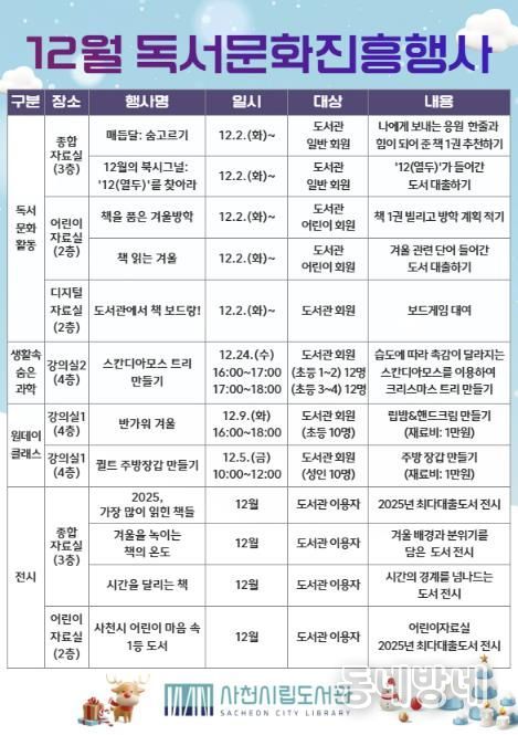 동네방네 김형규 기자 | 사천시립도서관은 12월 한 달 동안 시민들의 독서와 문화 생활을 풍성하게 하기 위해 다양한 독서문화진흥행사를 운영한다.