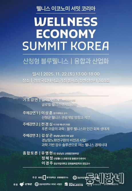 동네방네 김형규 기자 | 경상국립대학교 RISE 사업단(지역연계·산청군 과제)과 경기대학교 관광종합연구소는 산청군의 웰니스 관광 발전을 위한 업무협약(MOU)을 체결하고, 그 후속 성과를 공유하고 실행 과제를 구체화할 ‘웰니스 이코노미 서밋 코리아(Wellness Economy Summit Korea)’를 11월 22일 오후 1시 가좌캠퍼스 GNU컨벤션센터 303호에서 연다.
