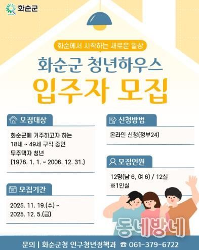 동네방네 김형규 기자 | 화순군은 지역 청년의 안정적인 주거환경 조성과 자립 기반 마련을 위해 2026년 화순군 청년하우스 입주자 모집을 11월 19일부터 12월 5일까지 진행한다고 밝혔다.
