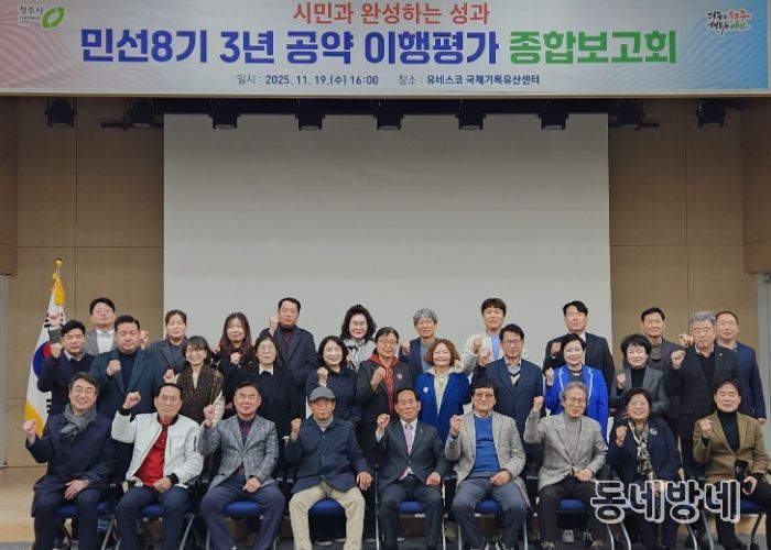 동네방네 김형규 기자 | 청주시는 19일 유네스코 국제기록유산센터에서 공약이행시민평가위원들과 관계 공무원 등 80여 명이 참석한 가운데 ‘민선8기 3년 공약 이행평가 종합보고회’를 개최했다.