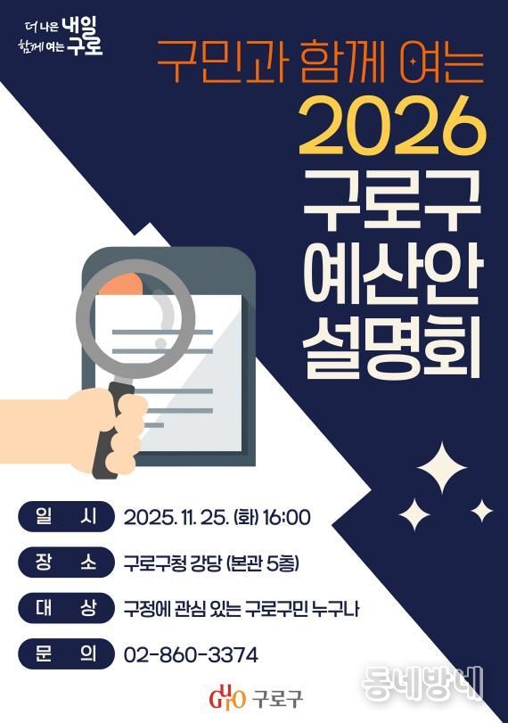 동네방네 김형규 기자 | 구로구가 11월 25일 오후 4시 구로구청 5층 강당에서 ‘구민과 함께 여는 2026년 구로구 예산안 설명회’를 연다.
