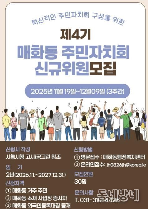 동네방네 김형규 기자 | 시흥시 매화동 행정복지센터는 12월 9일까지 ‘제4기 매화동 주민자치회’ 신규위원 30명을 공개 모집한다. 신청은 매화동 행정복지센터 방문 또는 전자우편을 통해 가능하다.
