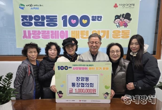 동네방네 김형규 기자 | 의정부시 장암동주민센터는 11월 19일 장암동 통장협의회가 성금 100만 원을 전달하며 ‘100일간 사랑릴레이 배턴 잇기’에 힘을 보탰다고 밝혔다.