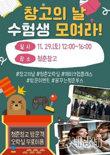 이와 함께 청년센터 꿈꾸는청춘 부스가 운영돼 청년정책 안내와 참여형 이벤트를 진행한다. 아울러 행사 당일 수험표를 지참한 고3 수험생에게는 특별 할인 혜택을 제공해 청춘창고를 더욱 부담 없이 즐길 수 있도록 했다.