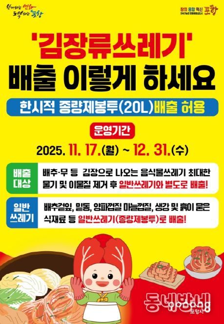 동네방네 김형규 기자 | 포항시는 김장철을 맞아 일시적으로 다량 배출되는 김장부산물 쓰레기를 원활히 처리하기 위해 ‘김장부산물쓰레기 특별 수거기간’을 운영한다고 밝혔다.