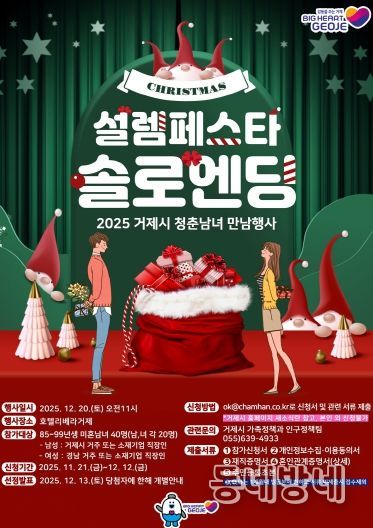 거제시는 “연말 감성을 담아 청년들이 부담 없이 교류할 수 있는 자리가 되도록 세밀하게 준비 중”이라며, “이번 행사가 새로운 인연을 찾는 기회가 되고, 지역사회에도 긍정적인 활기를 더하길 바란다”고 말했다.