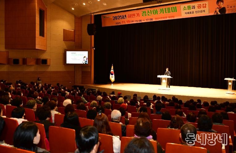 동네방네 김형규 기자 | 경산시는 19일 경산시민회관 대강당에서 시민 600여 명이 참여한 가운데 『2025년 하반기 경산 아카데미』를 성황리에 개최했다. 이번 경산 아카데미는 숭실사이버대학교 학과장 이호선 교수를 초청하여‘소통과 공감, 지혜로운 인간관계’라는 주제로 진행됐다.