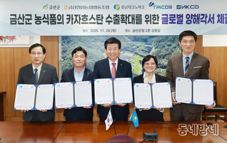군 관계자는 “이번 협약을 통해 금산군 농식품이 카자흐스탄 시장을 넘어 중앙아시아 전역으로 확장할 수 있는 가능성을 보여줬다”며 “금산군 농식품이 글로벌 시장에서 경쟁력을 갖출 수 있도록 노력하겠다”고 말했다.