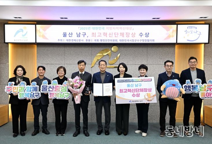 동네방네 김형규 기자 | 울산 남구는 ㈜대한경제신문사가 주최하고 국회 행정안전위원회와 대한민국 시장·군수·구청장협의회가 후원한‘2025 대한민국 지방자치혁신대상’ 시상식에서 ‘최고혁신단체장상’을 수상했다고 21일 밝혔다.