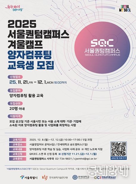 한편, 오는 12월 8일 개강하는 SQC 겨울캠프 ‘양자컴퓨팅 활용 과정’은 서울퀀텀캠퍼스·연세대학교·IBM 협력으로 구성된 5일 집중 실습형 과정이다. 교육 신청은 12월 1일까지 온라인으로 접수되며, 서면심사 후 20여 명이 선발된다. 교육 신청은 서울시, 한국과학기술연구원, 연세대학교 양자정보기술연구원 누리집에서 지원신청서를 내려받아 제출하면 된다.