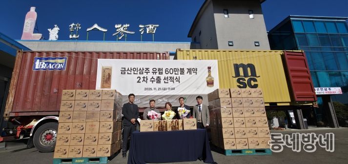 동네방네 김형규 기자 | 금산군 금성면 소재 인삼주 제조업체 ‘금산인삼주’는 지난 21일 10만 달러 규모 인삼주를 선적하며 2차 오스트리아 수출길에 나섰다.