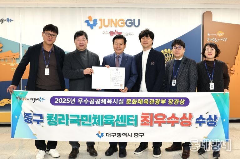 동네방네 김형규 기자 | 대구 중구는 중구 청라국민체육센터가 지난 20일 문화체육관광부와 국민체육진흥공단이 주관한 ‘2025년 우수 공공 체육시설 선정 공모’에서 체육관형 부문 최우수상(문화체육관광부 장관상)을 받았다고 밝혔다.
