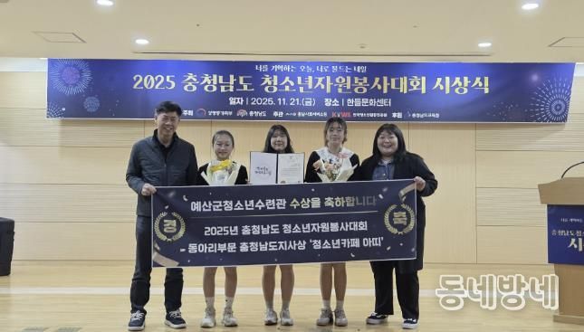 동네방네 김형규 기자 | 예산군은 예산군청소년수련관 청소년카페 ‘아띠’가 2025년 충청남도청소년자원봉사대회에서 동아리부문 도지사상을 수상했다고 25일 밝혔다.