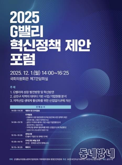 동네방네 김형규 기자 | 금천구는 G밸리의 미래 발전 방향과 혁신전략을 논의하기 위한 ‘G밸리 혁신정책 제안 포럼’이 12월 1일 국회의원회관 제7간담회실에서 개최된다고 밝혔다.