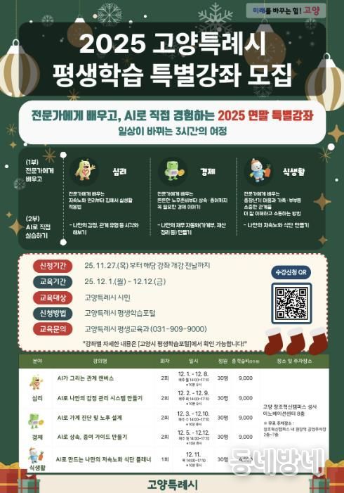 동네방네 김형규 기자 | 고양특례시는 지난 상반기부터 진행된 평생학습 시민강좌가 시민들의 큰 호응을 얻은 데 힘입어 12월 1일 2025년을 마무리할 특별강좌를 운영한다고 밝혔다.