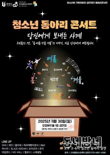 동네방네 김형규 기자 | 부천여성청소년재단이 운영하는 고리울청소년센터는 2025년 11월 30일, 부천시 고강동 소재 오정아트홀 1층 공연장에서 지역 청소년들이 직접 기획하고 무대에 오르는 특별한 공연, ‘청소년 동아리 콘서트 – 당신에게 보내는 사계’가 열린다.