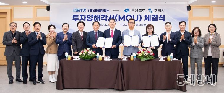 동네방네 김형규 기자 | 경상북도와 구미시는 25일 구미시청 3층 대회의실에서 양금희 경상북도 경제부지사, 김장호 구미시장, 박교상 구미시의회 의장, 박성훈 ㈜씨엠티엑스 대표이사 등이 참석한 가운데 ㈜씨엠티엑스와 경상북도·구미시 간 투자양해각서(MOU)를 체결했다.