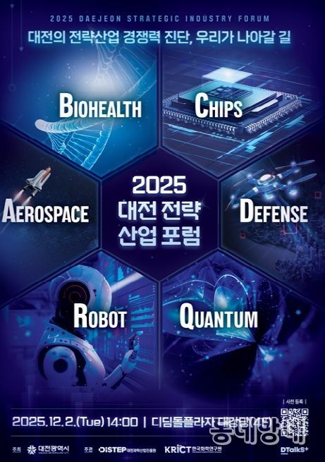 동네방네 김형규 기자 | 대전시는 대전과학산업진흥원(DISTEP), 한국화학연구원(KRICT)과 함께 오는 12월 2일 오후 2시, 한국화학연구원 디딤돌플라자 4층 대강당에서 ‘2025년 대전 전략산업 통합포럼’을 개최한다.