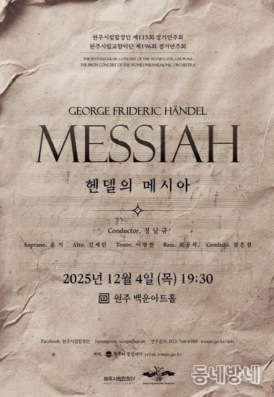 동네방네 김형규 기자 | 원주 시립합창단과 시립교향악단은 오는 12월 4일 오후 7시 30분 백운아트홀에서 정기연주회 ‘헨델의 메시아’를 개최한다.