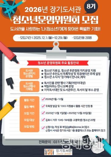 동네방네 김형규 기자 | 김포시 장기도서관은 2026년 제8기 청소년운영위원회 위원으로 활동할 김포시 거주 13세~18세 청소년 20명을 오는 12월 1일부터 모집한다.