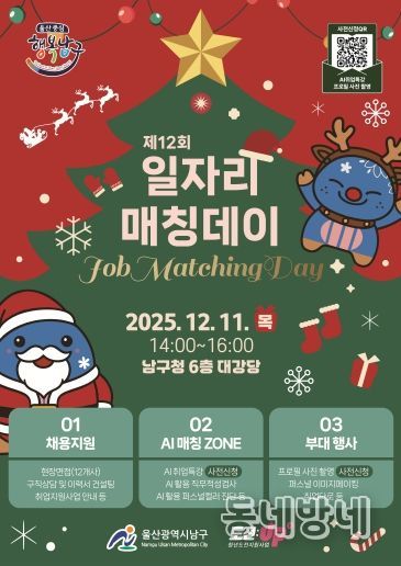동네방네 김형규 기자 | 울산 남구(구청장 서동욱)는 올해 마지막 대규모 채용행사인 ‘제12회 일자리매칭데이’를 앞두고 구인기업과 구직자 모집을 본격적으로 시작한다.