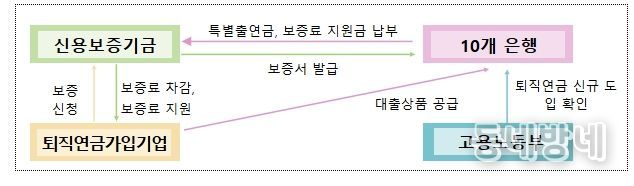 고용노동부 주관으로 민·관·공이 협력하여 실시하는 이번 사업을 통해, 10개 은행은 총 132억원을 신용보증기금에 출연했다. 그리고 신용보증기금에서는 이를 재원으로 퇴직연금제도를 신규 도입한 중소기업이 경영자금을 대출받을 수 있도록 대출금액에 대하여 기업당 최대 5억원, 총량 약 3,300억원 규모의 ‘특별출연 협약보증’ 및 ‘보증료 지원 협약보증’을 지원할 예정이다. 중소기업은 협약보증을 토대로 10개 은행에서 경영자금을 대출받을 수 있다.