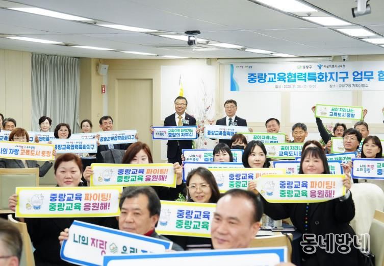 동네방네 김형규 기자 | 중랑구는 11월 26일 구청 4층 기획상황실에서 서울특별시교육청과 ‘중랑교육협력특화지구’업무협약을 체결했다. 이번 협약은 2019년 혁신교육지구, 2023년 미래교육지구 추진에 이어 지역 교육 협력사업을 확장하는 단계로, 구·교육청·학교 간 협력 구조를 체계화해 지역 기반 교육 환경을 강화하기 위해 마련됐다.