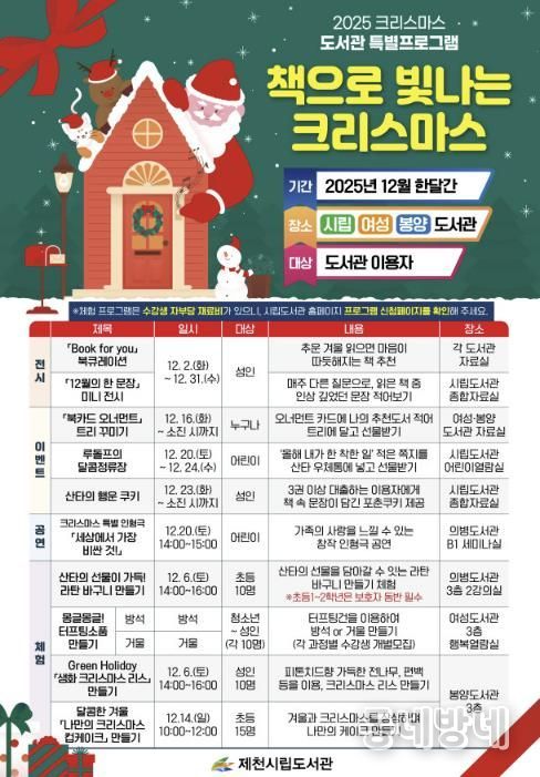 동네방네 김형규 기자 | 제천시립도서관은 2025년 연말을 맞이하여 12월 한 달간 특별프로그램 ‘책으로 빛나는 크리스마스’를 운영한다.
