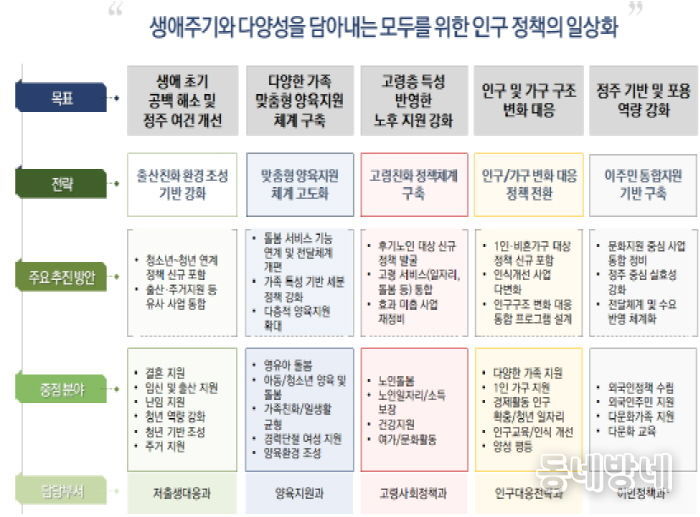 보고서는 경기도 인구정책의 비전을 ‘생애주기와 다양성을 담아내는 모두를 위한 인구정책의 일상화’로 설정하고, ▲생애 초기 공백 해소 및 기반 조성 ▲다양한 가족형태 맞춤형 양육지원 체계 구축 ▲고령층 특성 반영한 노후지원 강화 ▲인구 및 가구 구조 변화 대응 ▲정주 기반 및 포용 역량 강화라는 5대 정책목표를 제시했다.