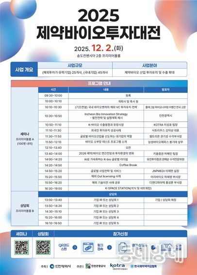 동네방네 김형규 기자 | 인천광역시가 주최하고 인천관광공사와 KOTRA, 한국제약바이오협회가 공동 주관하는 ‘제약바이오투자대전’이 오는 12월 2일 인천 송도컨벤시아 프리미어볼룸에서 열린다.