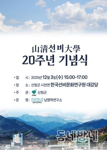 동네방네 김형규 기자 | 경상국립대학교 남명학연구소와 산청군이 공동 운영하는 산청선비대학이 개교 20주년을 맞아 12월 3일 오후 3시 한국선비문화연구원에서 기념식을 개최한다.