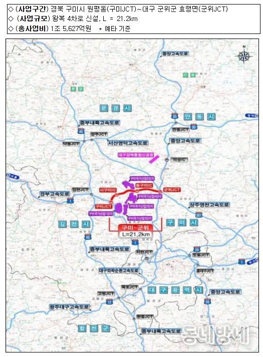 동네방네 김형규 기자 | 국토교통부는 11월 27일 열린 재정사업평가위원회(기획재정부 주관)에서 구미-군위 고속도로 건설사업이 사업 타당성을 확보하여 예비타당성조사를 통과했다고 밝혔다.